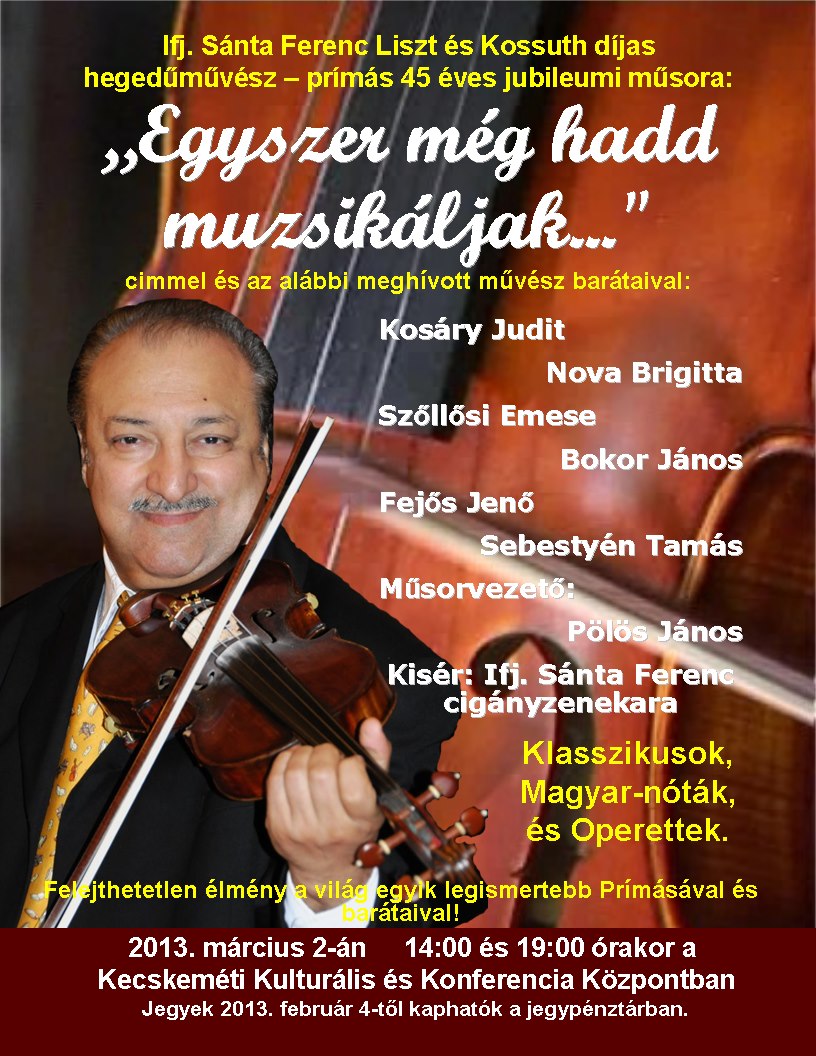 Kezdőlap>"EGYSZER MÉG HADD MUZSIKÁLJAk..." ifj. Sánta Ferenc hegedűművész 45 éves Jubileumi műsora 2013. 03. 02. KECSKEMÉT